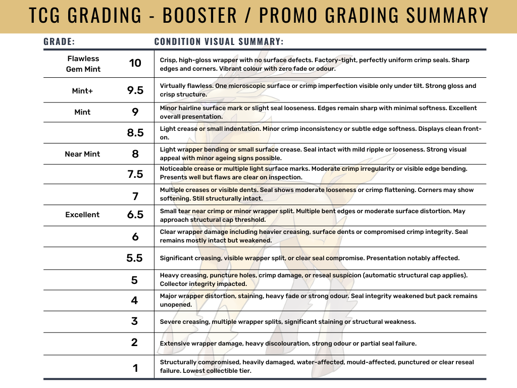 At TCG Grading, we score based on a 1-10 grading system by analysing 100 points of contact on your item across multiple subgrade categories. For sealed booster packs, condition is driven primarily by wrapper integrity and seal preservation. In the case of our Booster Packs we employ a grading weight system. These weightings reflect collector priorities: visual appeal first, seal integrity second, structural crispness third.