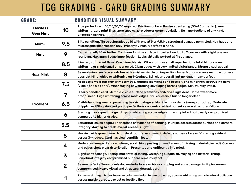 At TCG Grading, we score based on a 1-10 grading system by analysing 100 points of contact on your card across multiple subgrade categories.
